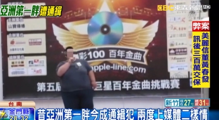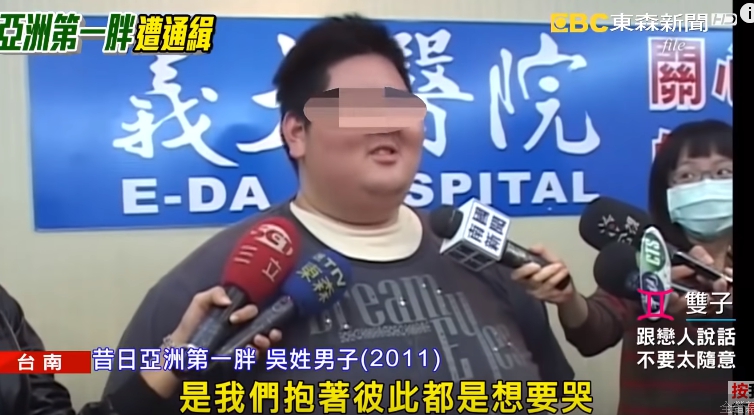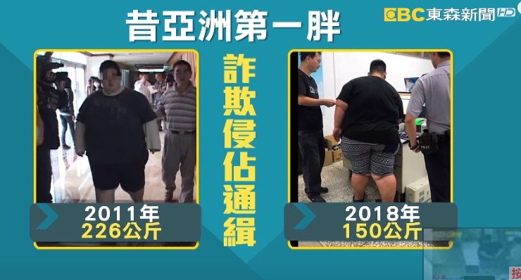 原來吳姓男子曾經因為減重話題上過媒體,當時他對唱歌很有自信,想要靠手術減重參賽,2011年時他體重226公斤被稱為亞洲第一胖,中間曾輕瘦到126公斤,這次被抓體重又回胖到150公斤,罪名則是詐欺和侵佔罪通緝。
