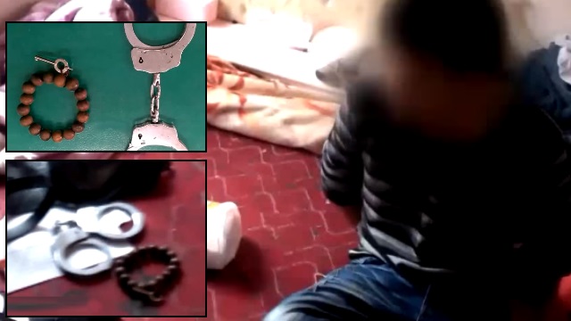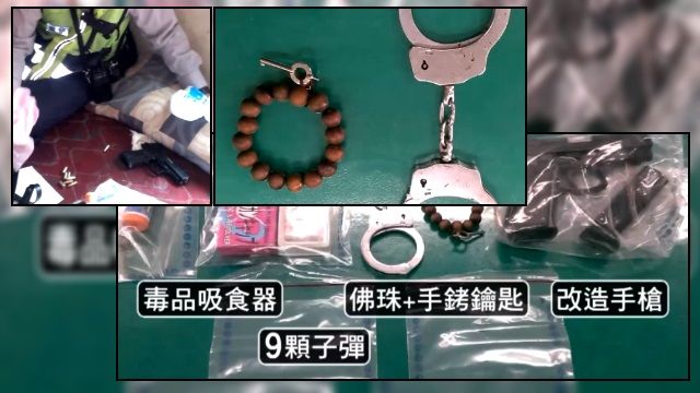 這名林姓男子坐在床邊,手上還帶著手銬,員警仔細的翻出男子身上的物品,就連外套口袋也不放過。員警在林姓男子身上搜出一把改造手槍和9顆子彈、槍套 、手銬以及毒品吸食器等等,眼尖的員警更發現林姓男子手腕上的佛珠好像不太對勁,一把手銬鑰匙附掛在佛珠上,林姓男子還辯稱是因為佛珠斷裂才會利用鑰匙勾住,不過還是被員警識破,猜測狡猾的林姓嫌犯想在被逮時趁機打開手銬逃離。