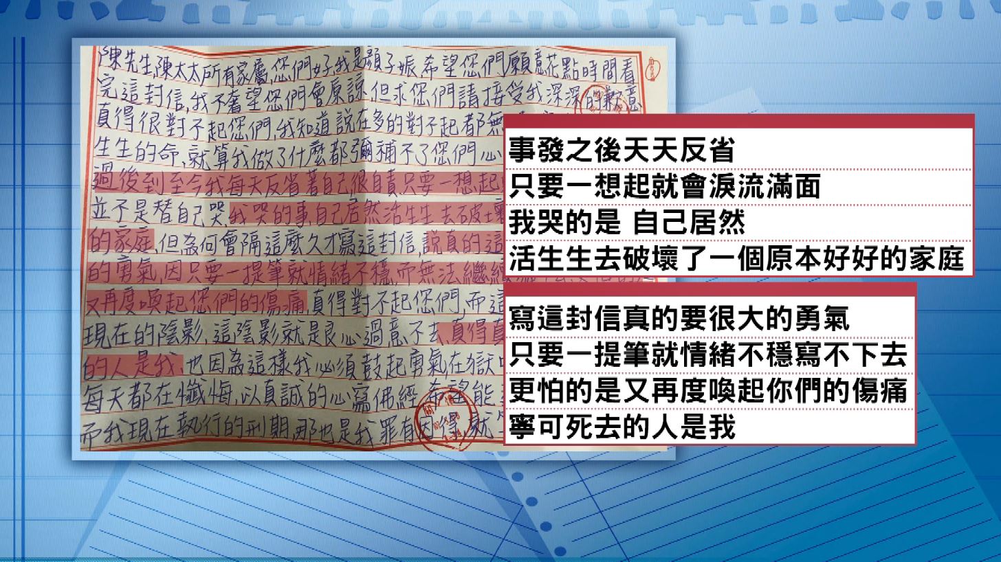 判刑,一審重判9年6個月,但民事賠償還沒定案,口口聲聲說的賠償該怎麼賠?顏子娠的家人也沒有代替她向死者父母道歉,口口聲聲說懊悔,但這兩張文情並茂、請求諒解的悔過書,在家屬看來,恐怕還是很難感受到顏子娠是真心悔改。