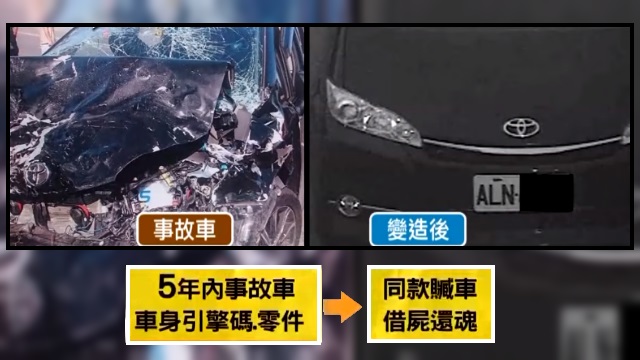 明明已經發生車禍,車子嚴重毀損,但卻還是查到車子在路上趴趴走,高雄警方進一步追查,發現原來是桃園一間無照保養廠,專找5年內的事故車,把合法的車身及引擎號碼全都換到另一輛同款的贓車上,就這樣借屍還魂,業者鑽法律漏洞,營業十年賣出4百多輛車,不法所得高達上千萬元。