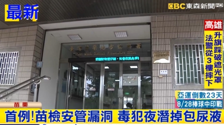 地檢署進出管制,卻發生一名葉姓毒蟲上個月21日到苗栗地檢署定期報到驗尿後躲進廁所,等地檢署人員下班後偷偷溜回採尿室掉包,從2樓跳下逃走。