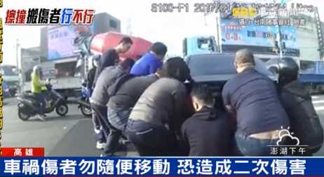 高雄市鳥松路上發生廂型車和機車擦撞的車禍,機車騎士撞上轉彎的廂型車,當場倒地不起,廂型車駕駛擔心受傷騎士躺的地方有危險。直接下車將他拖拉到路邊,雖然是出於善意,但是這樣移動傷者的方式也引發爭議。