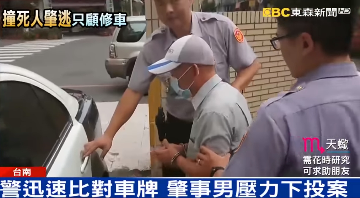 台南市一名罹癌蘇姓男子,清晨開車經過小東路和東興路口時,當場撞上騎機車的八十三歲老婦人,蘇姓男子肇逃後回家澡修車,老婦人送醫不治,警方很快找出肇事男子身分,逼他在三個小時後就主動投案。