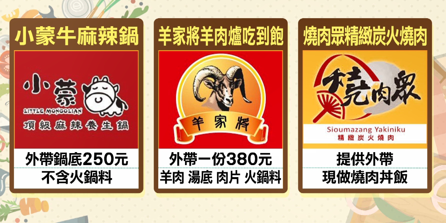 吃到飽餐廳打破以往只能內用的規定,小蒙牛麻辣鍋外帶鍋底250元,不含火鍋料,羊家將羊肉爐吃到飽,外帶一份380元,有羊肉、湯底、肉片還有火鍋料,燒肉眾炭火燒肉,想要外帶可以選擇多種現做丼飯,吃到飽料理競爭大,業者加進外帶,讓老饕在家也能享用美食。