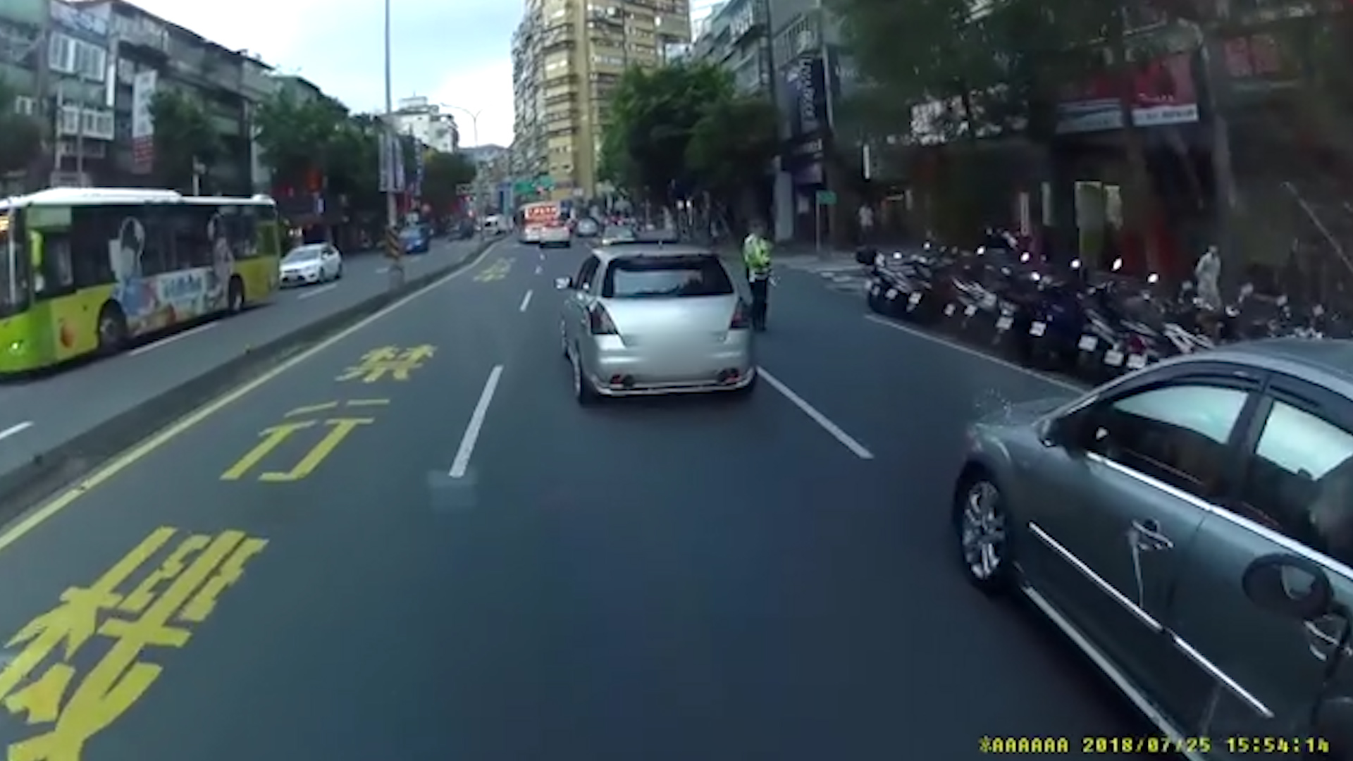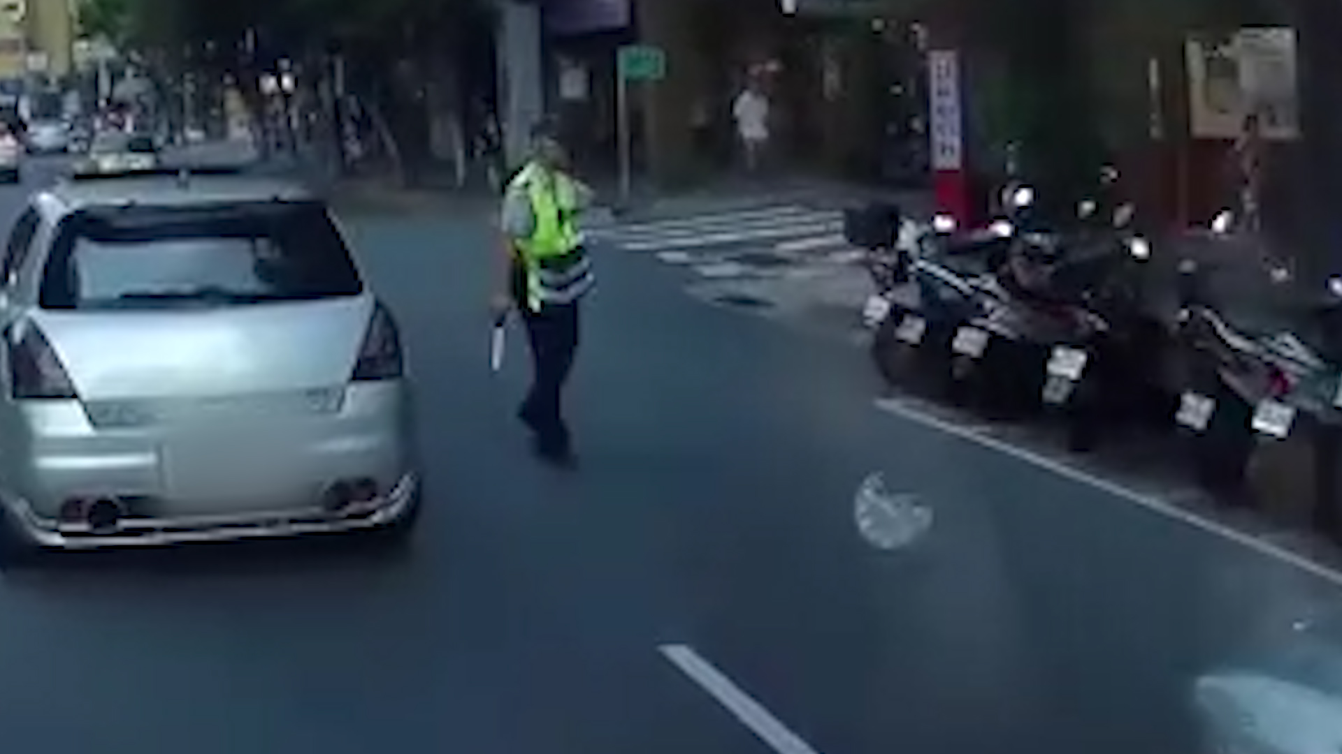 違規從非左轉車道轉彎,企圖插他隊,他無奈只好放慢速度讓道給他,不過才剛轉彎,就看見路旁一位員警將他「神攔截」,示意讓灰車停止,似乎要