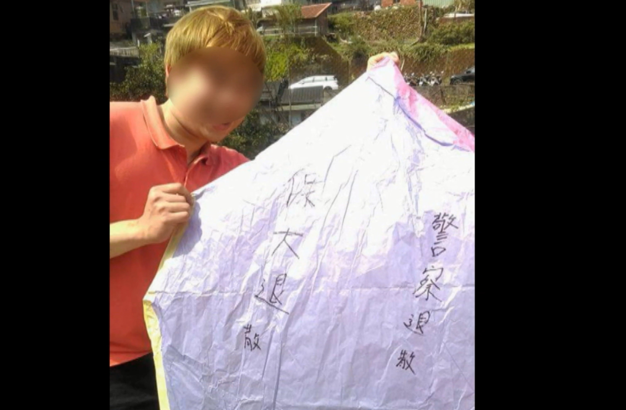 童姓嫌犯笑的燦爛,手裡拿著的天燈,上面寫著大大的「警察退散」,如今自己跟同夥都被逮,放天燈祈福,老天似乎不買單,現在看來格外諷刺。