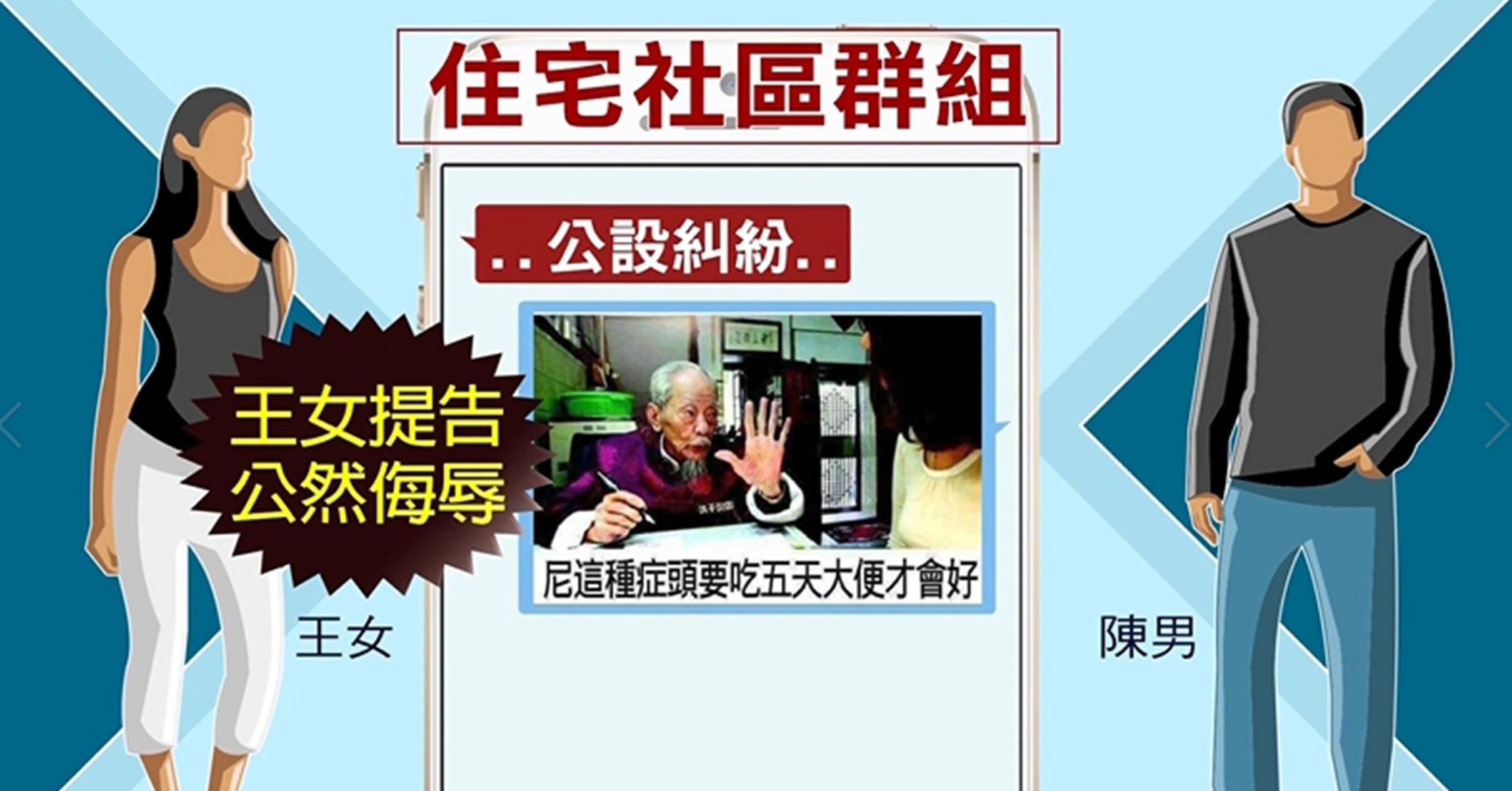 社區大樓住戶成立LINE群組,本來是溝通平台,卻傳出竹南鎮一棟大樓社區住戶在群組中發生爭執。王姓女子和陳姓男子因輪值管委會問題意見相左,陳姓男子在群組中回嗆一張KUSO圖片「尼這種症頭要吃五天排泄物才會好」,在22名成員的社區群組被嗆,王姓女子怒告對方公然侮辱,判決結果陳姓男子無罪。