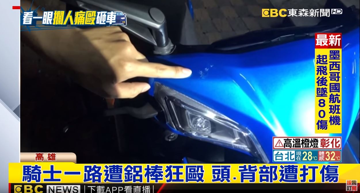 機車騎在路上,突然被後方車輛狂按喇叭,騎士嚇一跳,回頭看了一眼,想不到卻被轎車強行攔下,轎車駕駛一下車就氣沖沖地拿出鋁棒,朝著機車狂敲猛砸。駕駛也不讓騎士解釋,只是一直猛砸,還直接把人拉下機車,拿著手上的鋁棒狂毆,騎士難以招架,一路挨打,被打中頭部、背部,一度想逃走,卻被轎車駕駛抓回來,駕駛離開前,氣還是沒消,又朝機車後方不斷狂打。