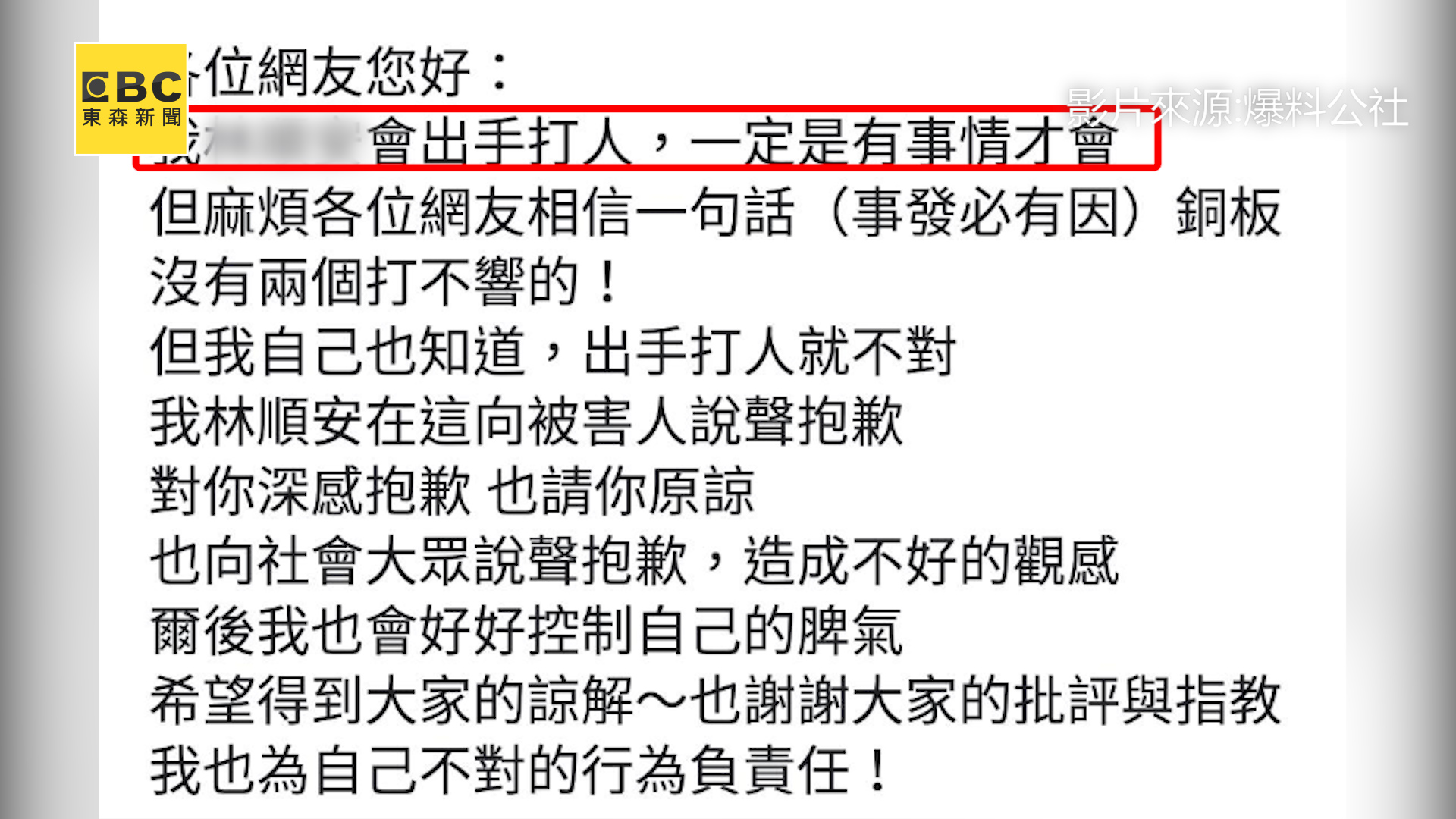 而今日打人的林姓男子在自己個版PO文:,「麻煩各位網友過目,話說,受害人為什麼只提供我打他的影片而已?怎麼沒有提供先前他罵我的影片?在我按喇叭前,他先開口罵我,當下我叫他停車,但他就繼續行駛沒有停,後來我才按喇叭追上去攔車的。我林XX會出手打人,一定是有事情才會,但麻煩各位網友相信一句話(事發必有因)銅板沒有兩個打不響的!但我們自己也知道,出手打人就不對我在這向被害人說聲抱歉對你深感抱歉,也請你原諒也向社會大眾說聲抱歉,造成不好的觀感,爾後我也會好好控制自己的脾氣,希望得到大家的諒解~也謝謝大家的批評與指教我也為自己不對的行為負責任!」