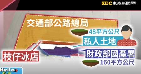 攤開地籍圖資,原有的冰店位置前面這塊土地是交通部公路總局,後面大部分也屬於財政部國產署,有160平方公尺,只有中間狹長不規則的土地,約48平方公尺是私有土地,投訴人指控,過去跟冰店承租部分店面22年來都不知情,直到今年5月才得知,原來房東占用國有地,自己店面也將被拆除只好搬離。