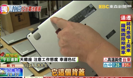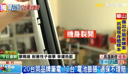 游先生說,2年前因為工作需要,公司一次採購20台同品牌、同型號的筆電,原本都用得好好的結果其中12台筆電,竟然在差不多時間,發生電池膨脹事件,但因為已經過保固期限,無法得到任何理賠。
