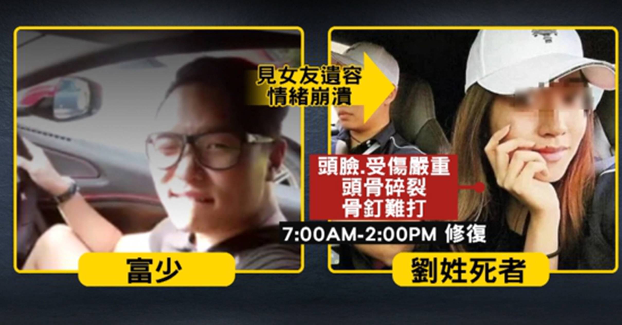 就怕刺激女方家屬,游瀚甯父母不敢對冥婚發表意見,死者生前 頭部臉部嚴重受創,頭骨多處碎裂,修復遺容花費不少功夫,因為連骨釘都很難打,遺體從早上7點修復到下午2點,富少看到女友遺容當場崩潰,跪倒在女友父母面前痛哭,希望取得原諒,告別式過後,游瀚甯陪著女友到火化場,走完人生最後一程。