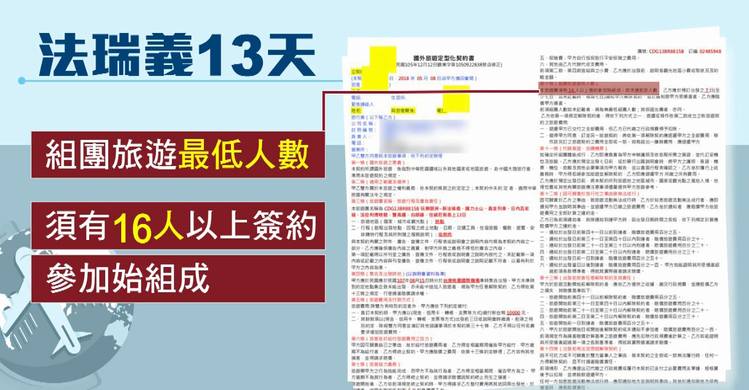 旅展買了8月份歐洲13天的行程,他說當時旅行社業務口頭跟他保證,這團已經達到組團人數,一定會出團,沒想到7月時卻被告知人數不夠無法成行,他這時回過頭仔細看合約,才發現合約裡有一項「組團必須達到16人才能成行」,就因為合約裡沒寫到「