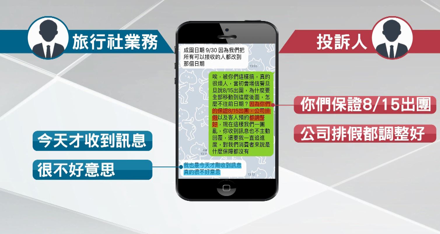 林先生秀出上個月跟旅行社業務協調的對話截圖,他強調業務有間接坦承自己有說過「保證出團」,但手上簽署的合約沒寫,很難舉證。新北市消保官王治宇:「如果契約寫的是16人,嘴巴講是保證,請他把合約改一下然後蓋章這樣子,這樣才能證明業者確實有這個承諾,假如有這承諾,就要負損害賠償責任。」遭投訴旅行社協理曾小姐:「我們並沒有違反契約書,所以並沒有違約賠償問題。」