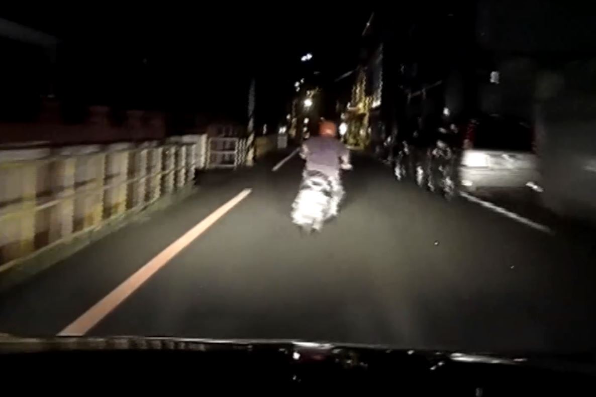 機車騎士闖紅燈,警察開車一路追,從大馬路追到十字路口,騎士轉進小巷子裡,一邊騎一邊回頭看警察有沒有追上來,警察擔心騎士來個急煞,也不敢追太近。騎士往前一直騎,警察跟在後頭一直追,燈光愈來愈暗,道路愈來愈狹小,連警察都擔心騎士騎到一半會摔倒。執勤員警:「我就是怕他滑倒啊。」