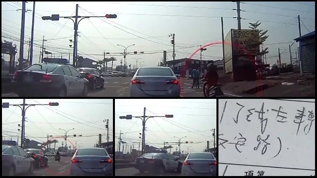 駕駛在雲林路和久安路口停等紅綠燈,汽機車都守規矩地等待,突然右手邊一名女子騎著機車看到紅燈沒打算停,還來個大左轉,沒兩段式就算了,還大咧咧地闖紅燈,這時停在內線車道的警車,車內員警全看在眼裡。
