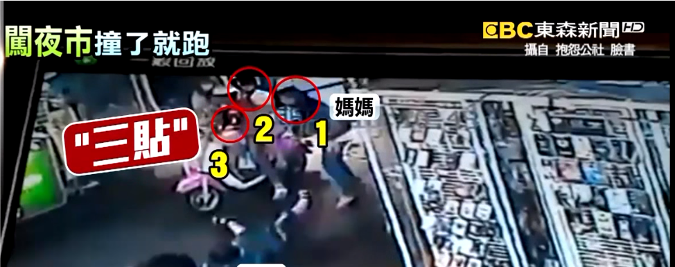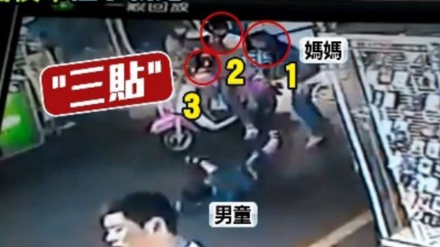 監視器畫面拍下,一名媽媽右手牽著小孩逛著街,這時綠色上衣的男童,突然放開母親的手走到左邊去,下一秒小男童剛好被一部機車給撞個正著,舉起雙手直接摔倒在地,小男童走到媽媽後方,正巧被媽媽擋住視線,仔細看這輛肇事的機車,車上一共有三個人,是三貼騎乘機車,撞到小男童之後,機車也停了下來,想要看一下情況,小男童倒地之後,他的母親趕緊將他扶起來,不過這時肇事的騎士,竟然把車繼續往前騎,又停頓一下,接著直接頭也不回的騎走了,附近攤販的老闆全都相當傻眼。