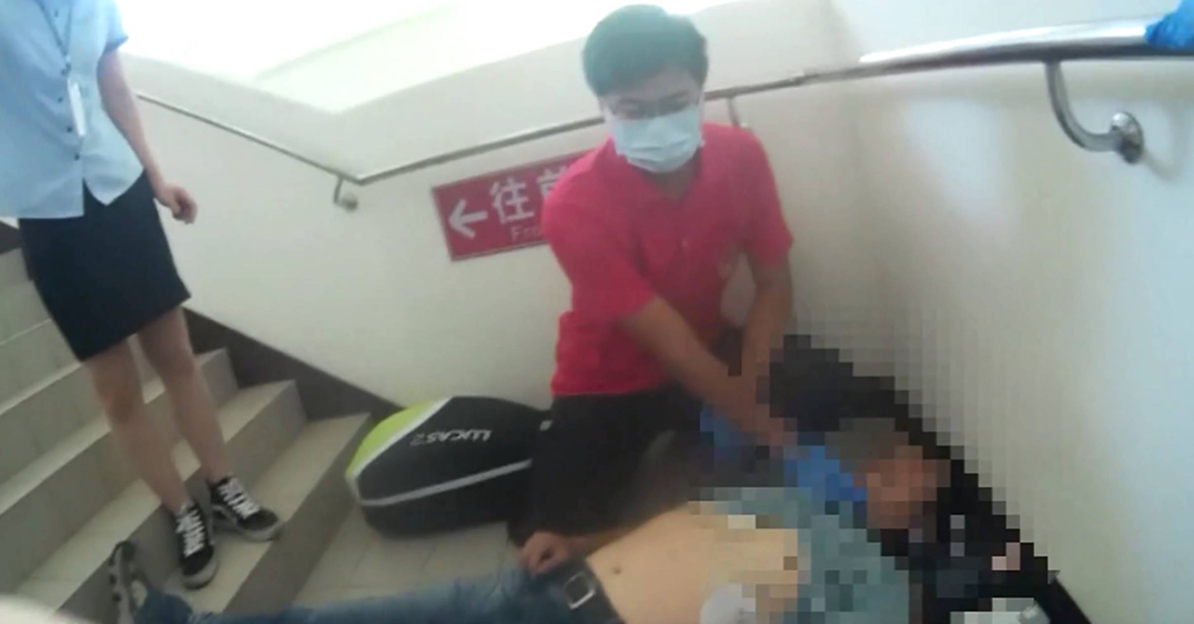 ▲▼男子休克昏倒在嘉義市轉運站的樓梯,臉色發白叫也叫不醒。(圖/東森新聞)