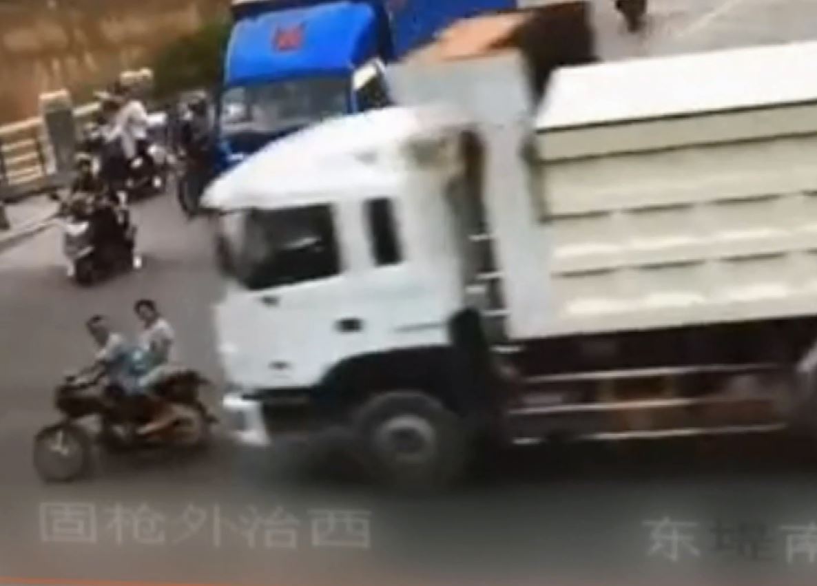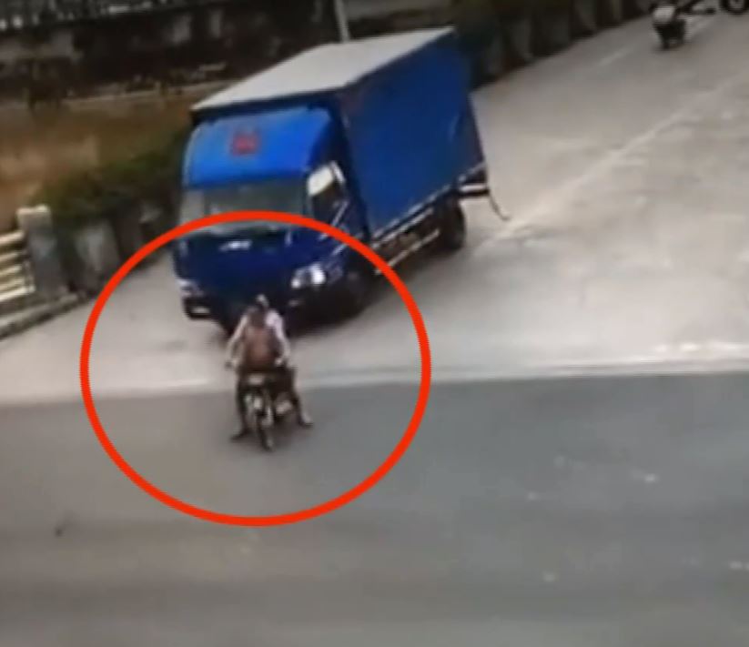 打著赤膊的男子不顧來往的車輛,直接往前衝,沒想到左邊出現一台大貨車,煞車不及,就這樣撞了上來。同樣在路口的還有一台藍色貨車,不過只有男子選擇強行通過,最後這名住在廣東的陶姓男子因此身亡,坐在後座的妻子則受傷送醫。