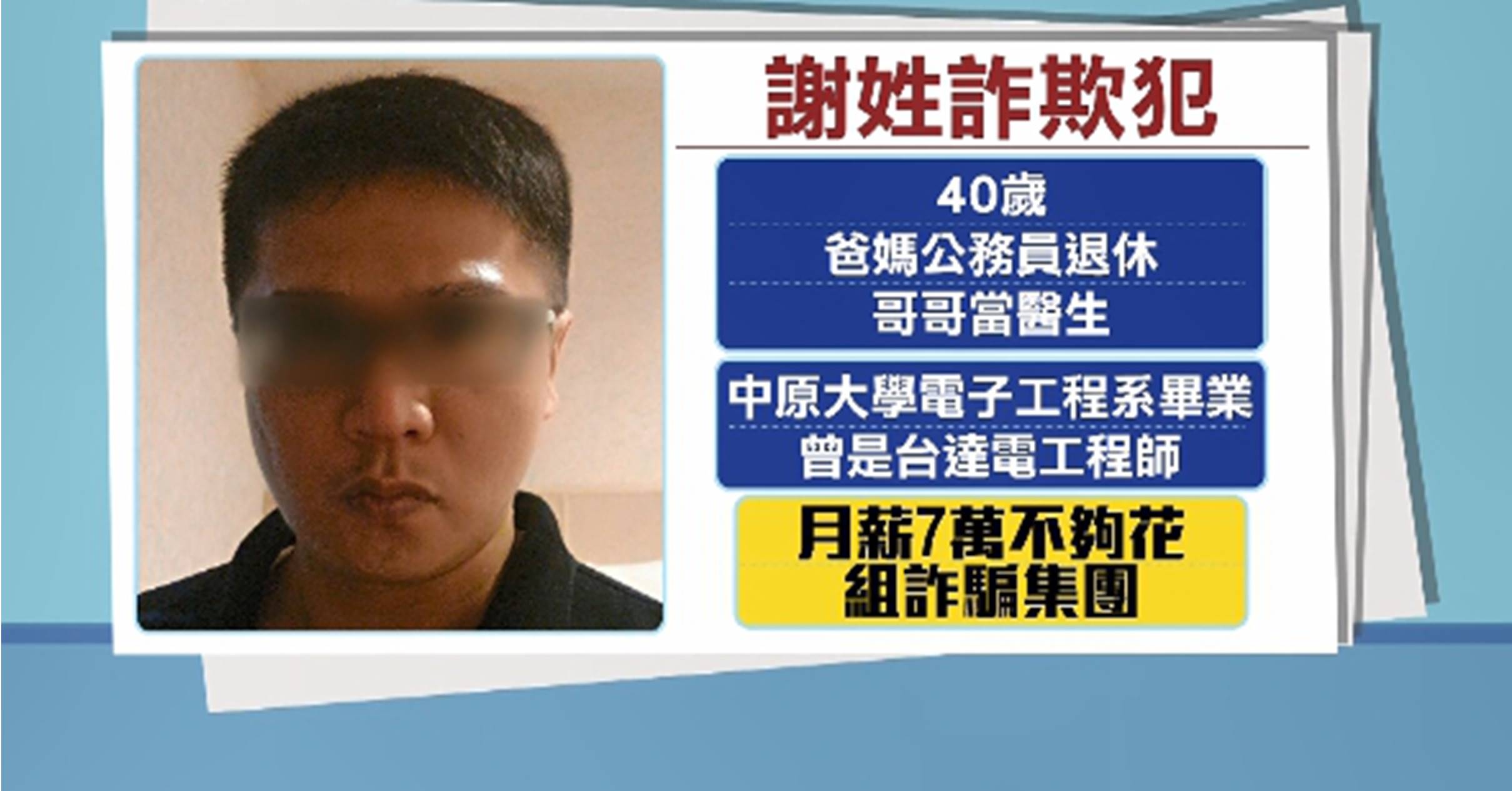 工程師嗎?)對,想不開。」媽媽對謝姓嫌犯的作為搖頭也無奈,謝姓嫌犯今年40歲,爸媽公務員退休,哥哥是醫生,他是中原大學子工程系畢業,原本是台達電工程師,但沉迷酒店溫柔鄉,月薪7萬元薪水不夠花,他開始組詐騙集團,民國100年網路詐騙上千萬元,被判刑後關了2年,民國105年重起爐灶,誆賣五月天門票200人受騙,民國106年又犯案,因為出獄後的案件都還在審理,他就利用空檔繼續騙人詐財。