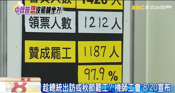 2大國籍航空機師透過工會發動的投票結果出爐,領票人數1212人,贊成罷工1187人,高達9成7贊成罷工,由於這個月總統蔡英文要出訪,下個月又有中秋節3天連假,會不會提前來個突襲?語帶保留。