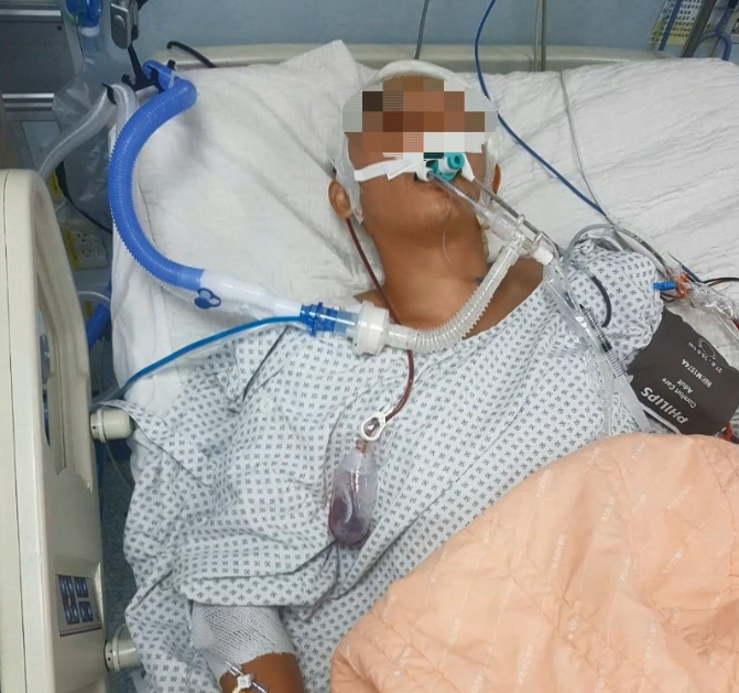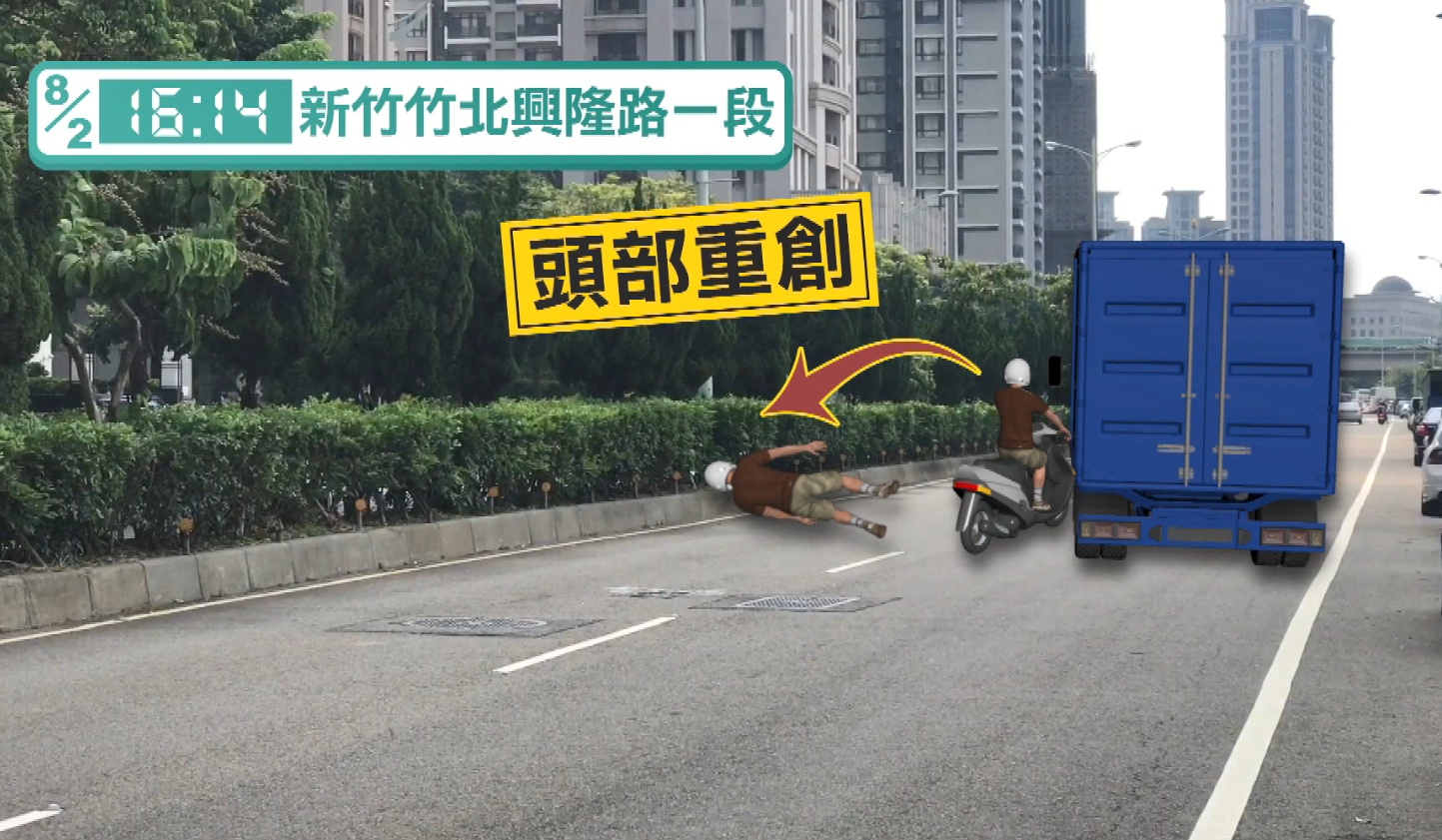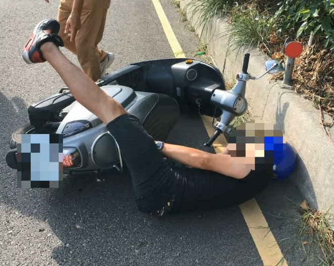 監視器拍下路樹後方邵姓騎士騎了過來,後面還跟著一輛貨車,下一秒騎士突然倒地,貨車也停了下來,只見機車車殼破裂,烤漆多處脫落,邵姓騎士躺在地上 一動也不動,儘管帶著安全帽,頭部還是受到重創,騎士顱內嚴重出血,躺在病床上接受插管治療,這一幕讓他的太太看了,真的好心痛!