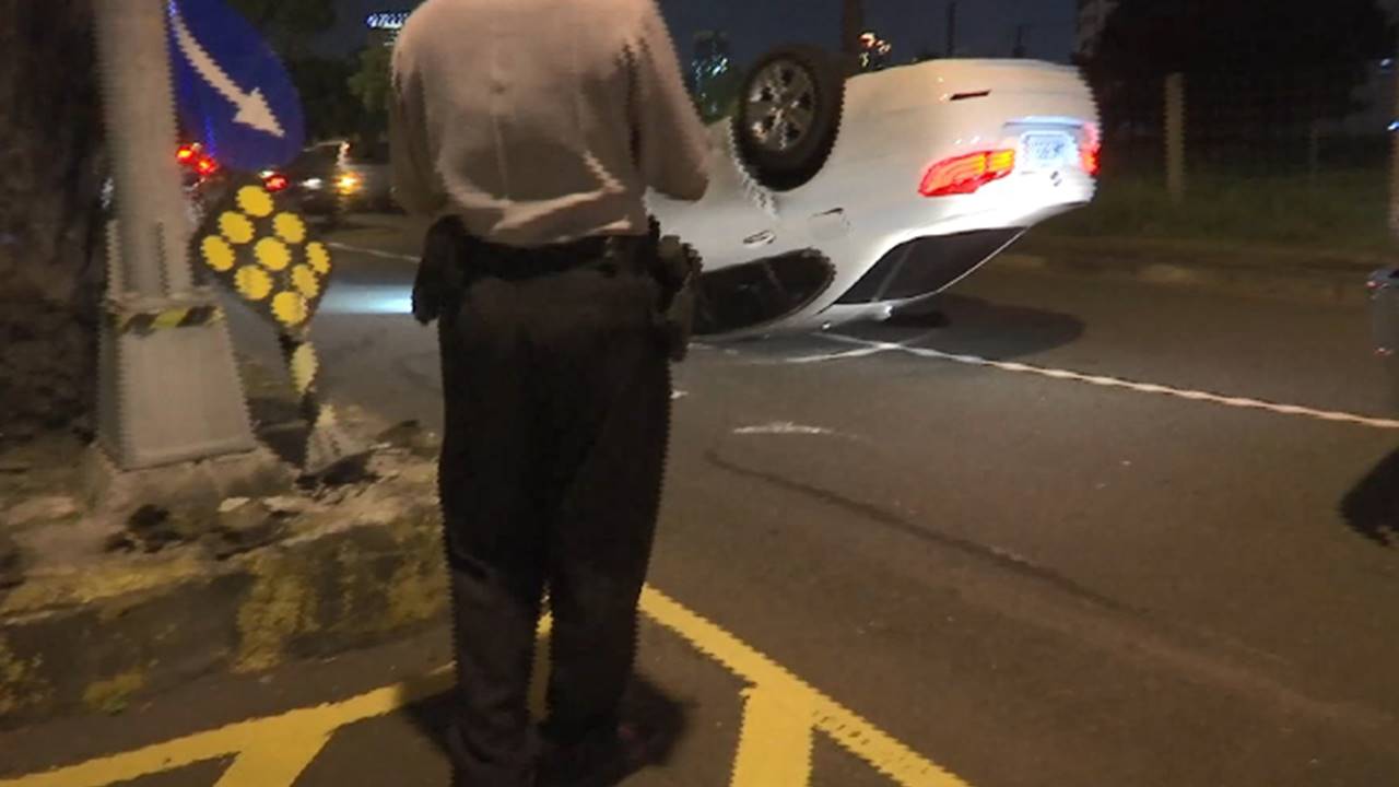 白色轎車停在大馬路中央,而且整個翻過來,影響其他車輛的行車動線,結果只能靠旁邊小心翼翼通過,還要出動員警,前來協助指揮交通。瞧瞧這一台轎車整台翻過來,前座的安全氣囊都爆開,車窗也被撞壞,分隔島上的指示標誌也都被撞歪,可見當時撞擊力道有多大。