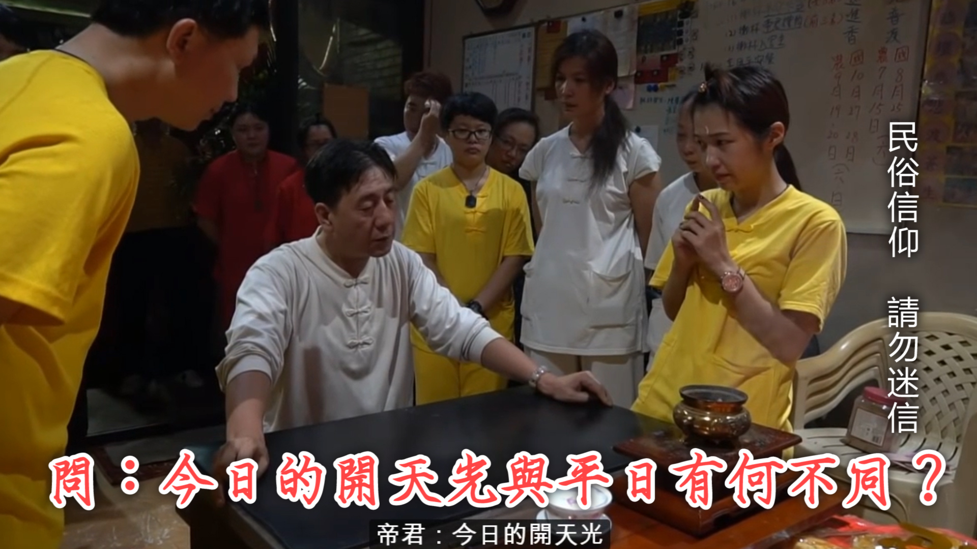 宮廟人員一同慶祝。有趣的是,帝君還一一測驗眾位師兄師姐對宮廟事務了解程度。其中測驗到蓮花太子乩身張名儀時,祂問:「今日的開天光與平日有何不同?」張名儀因不確定答案而心虛。