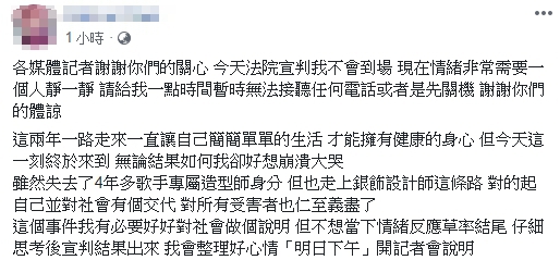 對於秦偉是否被重判?率先跳出來踢爆秦偉淫行的造型師在臉書回應,今日不會到現場,現在只想一個人靜一靜,「這兩年一路走來一直讓自己簡簡單單的生活,才能擁有健康的身心」,如今宣判即將到來,「無論結果如何我卻好想崩潰大哭」,她需仔細思考宣判結果,再整理好心情、情緒,將於明(9)日下午召開記者會說明。