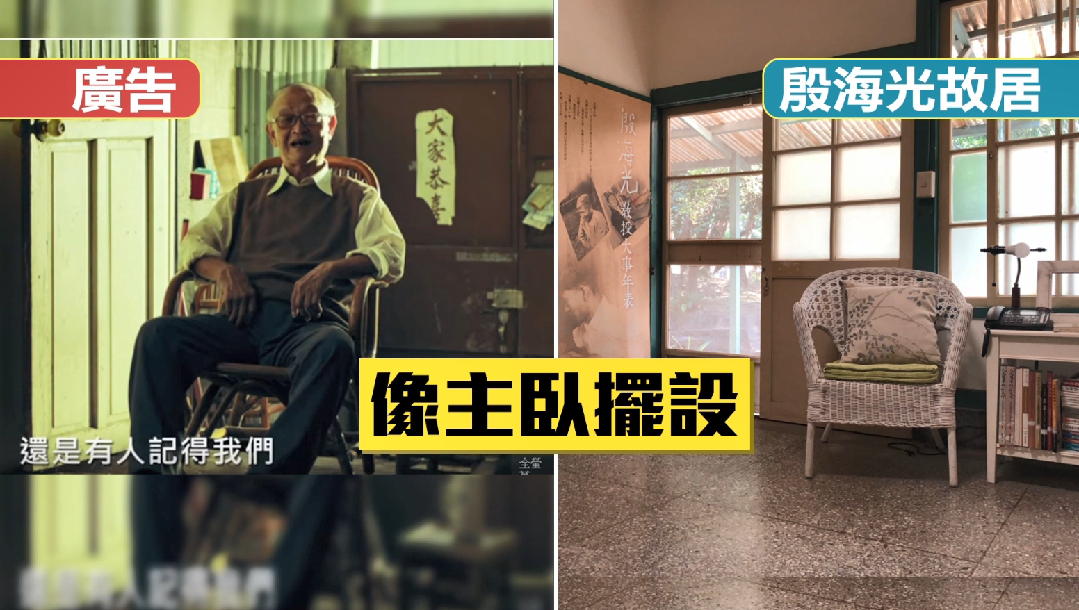 一般人來拍當然連人帶椅都會倒印出影子來,廣告中的老伯伯會被影射是殷海光,主要原因還有全聯當初設定的老伯伯臉書,大頭背景照用的就是一大片海,襯映著陽光就像在隱喻海光這個名字,另外在場景上,老伯伯坐在一扇門的前方,也跟殷海光故居,主臥擺設的這一角,有門有椅很相像。