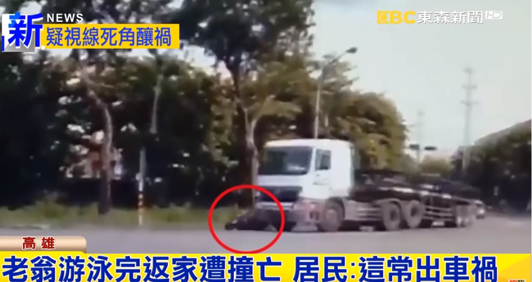 畫面中,一部拖板車正要過彎,在車子右側還有一名老翁,緩緩騎車也要過彎。接下來悲劇就發生了,騎車老翁被撞倒,硬生生被輾過,屍體碎成好幾片,當場死亡,肇事的拖板車似乎還不知道釀禍,往前開了將近50公尺,才被目擊民眾攔下。