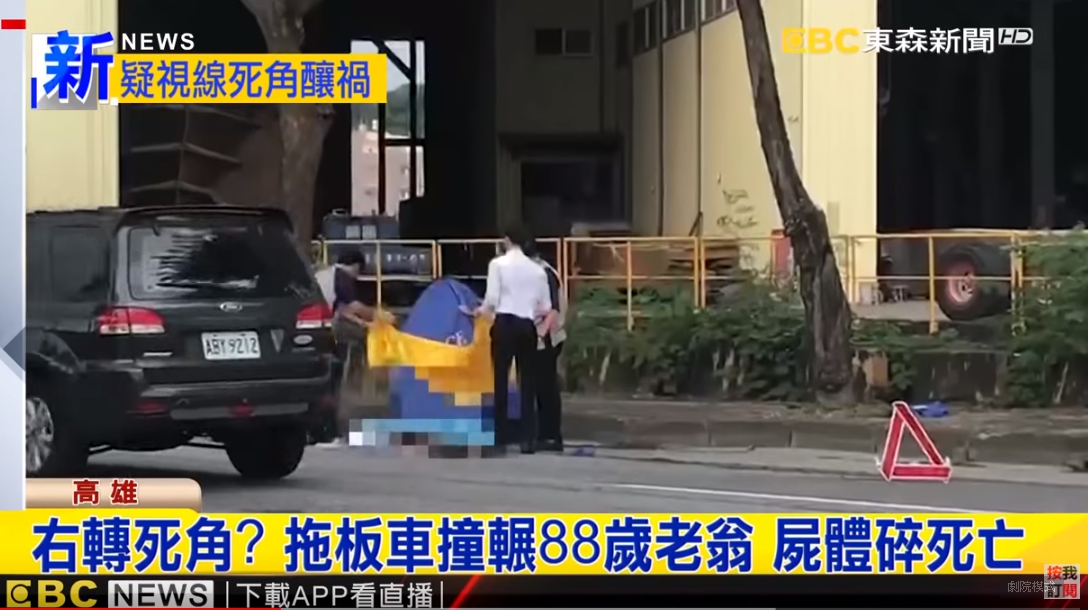 肇事的拖板車,車輪上還有血跡班班,駕駛也有19年開車經歷,當時下班正要去加油,疑似因為右轉死角,釀成死亡車禍,而88歲老翁妻子聽聞噩耗,趕到現場,看見丈夫遺體,癱軟痛哭,當地居民表示,該路段 十幾年來,經常發生車禍,這次釀成死亡意外,也盼相關單位重視改善。