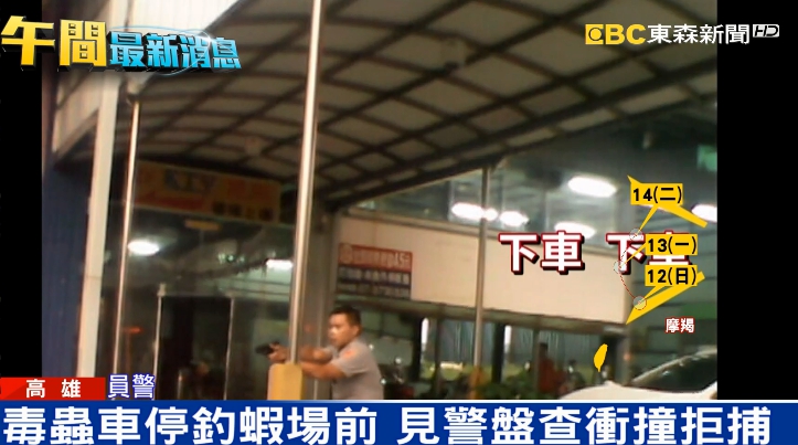看到黑色BMW車子停在釣蝦場前行跡可疑,員警上前要盤查,裡頭的毒蟲馬上開車要衝撞警車。