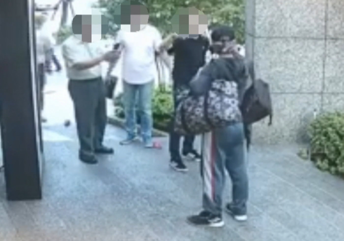 黑衣男子在騎樓下東張西望,一對母女牽手經過,男子突然伸手,抓女童書包,把女童整個人往上拉起來,媽媽嚇壞當場驚聲尖叫,急忙用雙手拉住寶貝女兒,但是這名男子像失去理智一樣,用力抓住女童,就像要當街把女童強押擄走,路人和餐廳店家,聽到母親驚恐的尖叫聲,通通跑過來喝止男子行為。