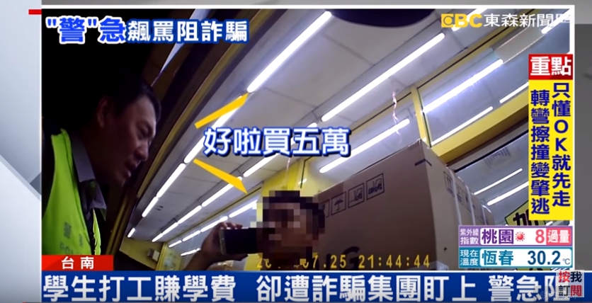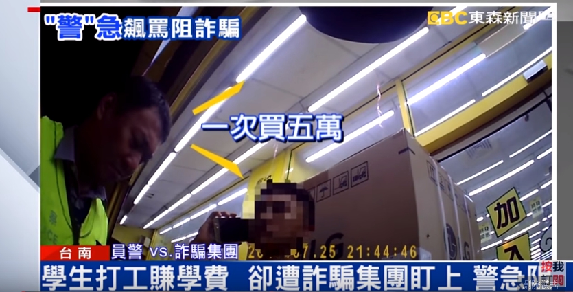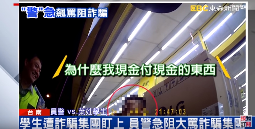 接到報案趕到3C賣場的員警,找到了準備要買點數的葉姓學生,連忙阻擋他,告訴他這一定是詐騙集團的手法,這時對方的電話打來了。