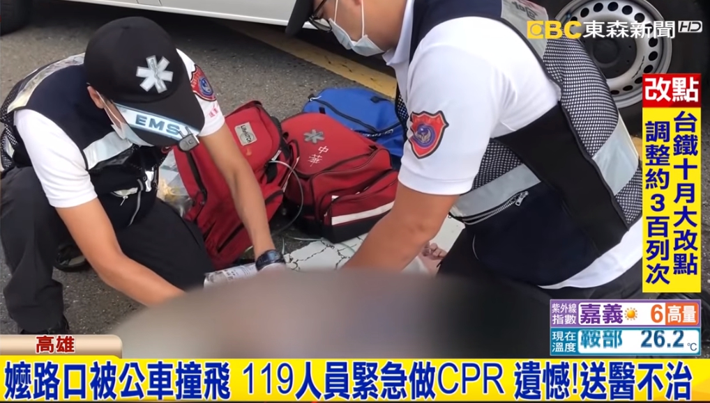 78歲的阿嬤練完氣功,騎著腳踏車在路上,速度不快,沒想到就在經過伊犁街跟西藏街口時,突然一輛公車高速開過來,阿嬤當場被撞,頭破血流倒地不起,119人員趕到緊急做CPR搶救。