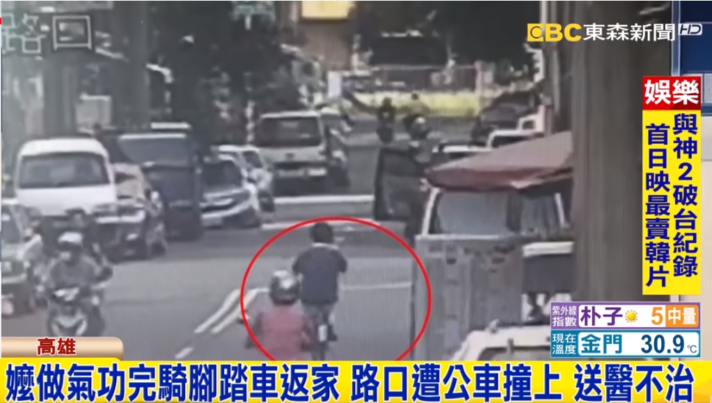 穿藍衣上的男子就是公車司機沒有酒駕,宣稱是阿嬤衝過來,和目擊者說法顯然有出入,而這名戴安全帽的女子,就是被撞阿嬤的女兒,相當焦急趕來了解。遭撞阿嬤女兒:「我媽媽,要去哪裡做氣功,做氣功哦,她就是在那個九如公園做氣功要回來。」