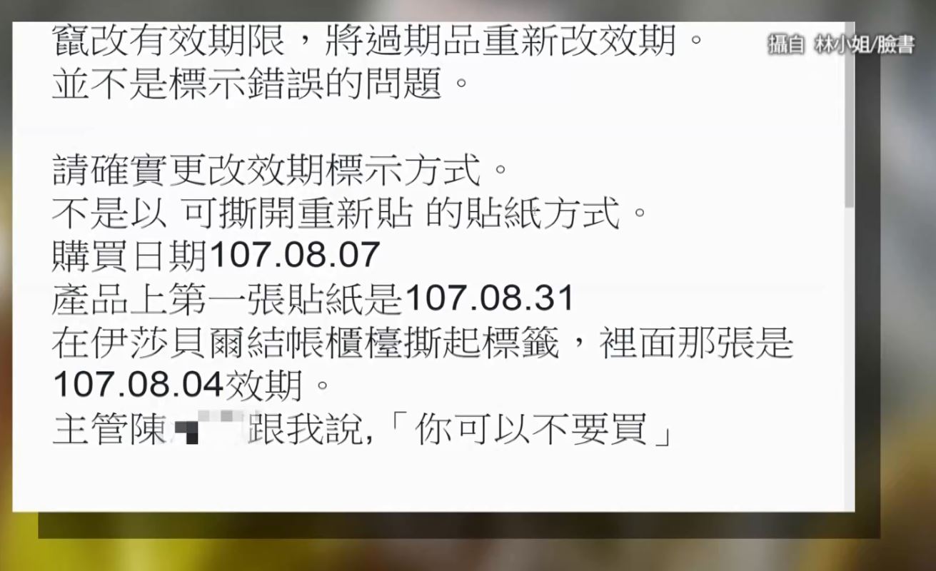 餅店老顧客踢爆業者亂換標籤改效期,上面的有效期限是8月31日,結果撕起來,有效期限變成8月4日。民眾說她向業者反應後,還遭一名陳姓主管嗆說「那妳不要買」。投訴民眾林小姐:「她就也沒有仔細看,代表他們也知道這件事,她就說,妳可以不要買,我說妳怎麼會是叫我不要買?」遭指控的女主管受訪表示自己完全沒講過這句話,還反控林小姐編故事栽贓,雙方隔空論戰。遭投訴餅店主管陳小姐:「我沒有嗆客人,旁邊都有很多人,林小姐個人的解讀,把我的話可能截取某一句話去講。」