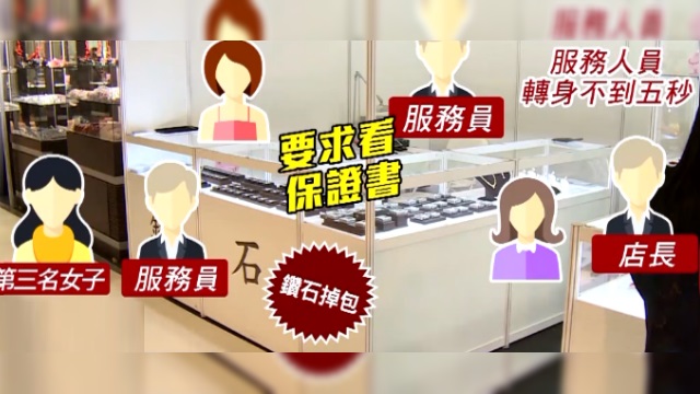 (圖/行竊的三名女子進入珠寶展,迅速鎖定鑽石櫃位,廠商回想當時行竊過程,鑽石展櫃採L型設計,兩名女子要求直接看裸鑽,當時櫃位兩名服務員都在旁服務,但隨後同夥的第三個人出現,支開其中一人,一旁的店長又被其中一人支開,最後座位區變成一對一,竊賊要求看鑽石保證書,服務人員轉身不到五秒,鑽石已經被掉包。)