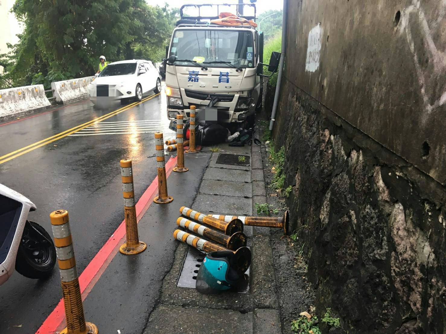 受摩羯颱風外圍雲系影響,中央氣象局今(12)日針對基隆市、台北市及新北市發布大雨特報,天雨路滑,新北市淡水淡江大學大門口就發生一起死亡車禍。今日上午約9點多,一名機車騎士行經淡江大學大門口斜坡處,正在停等紅綠燈時,另一名貨車司機正從水源街迴轉後往學府路方向行駛,不料卻因不明原因突然爆胎,失控撞上對向的賴男,強烈的撞擊力道,讓賴男當場連人帶車被撞進路過的白色貨車底盤,整個人被機車壓住,連路旁的反光防撞桿都連根斷裂。