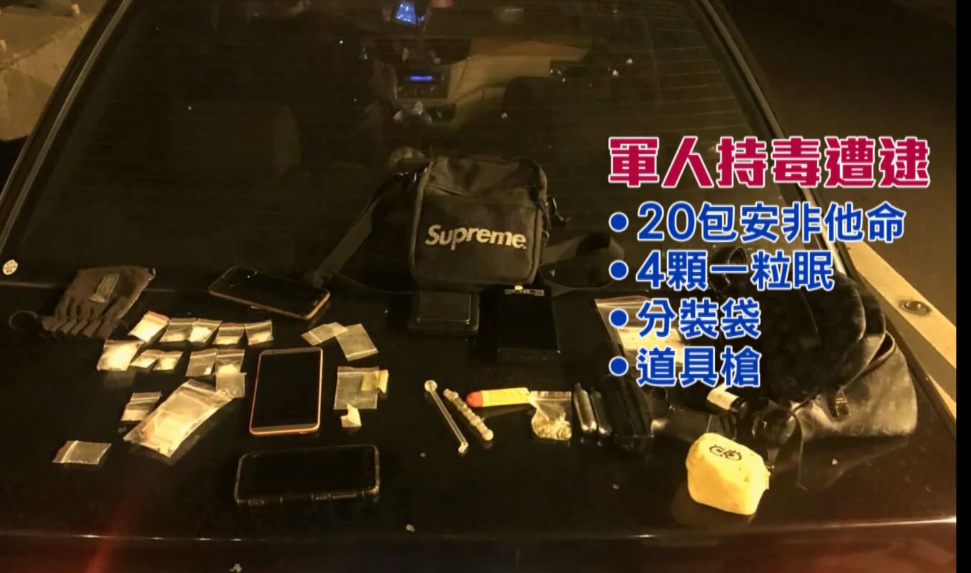 警方在車內搜出一共20包安非他命、4顆一粒眠、分裝袋、磅秤,甚至搜出一把道具槍。11日凌晨,簡姓軍人跟通緝犯友人持毒開車行經大安區,被警方攔下逮捕,說法還避重就輕。大安分局新生南路所長游進軍:「他目前的說法,毒品是向不知名男子購買的。」