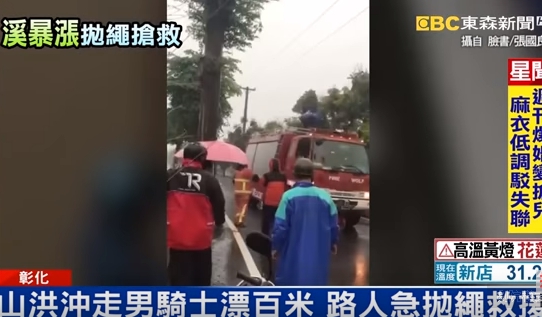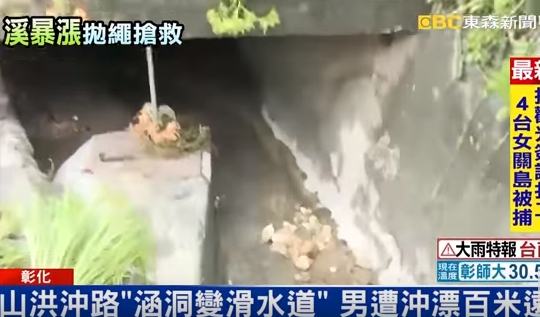 災情,就在山腳路6段竟然有機車男騎士,連人帶車被山洪沖進路旁的涵洞,一路被沖到100公尺遠的大排水溝裡,剛好被民眾看到,大家立刻拋繩救人。