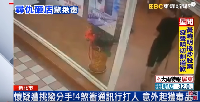 手機通訊行監視器拍下,2名黑衣男子急急忙忙衝進去,過沒多久另一人手持棍棒進門,後面還跟著好幾人,算一算一共4名惡煞,持武器衝進通訊行,朝人就是一陣亂打,時間就在14號下午。