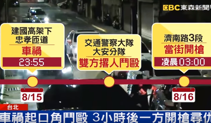 2派人馬在交通警察分隊前大膽叫囂、鬥毆,好幾人被打到頭破血流,警方出動快打部隊到現場,連忙將人架開,但他們離開後又在濟南路3段上碰到,結果一方直接當街開槍嗆聲。