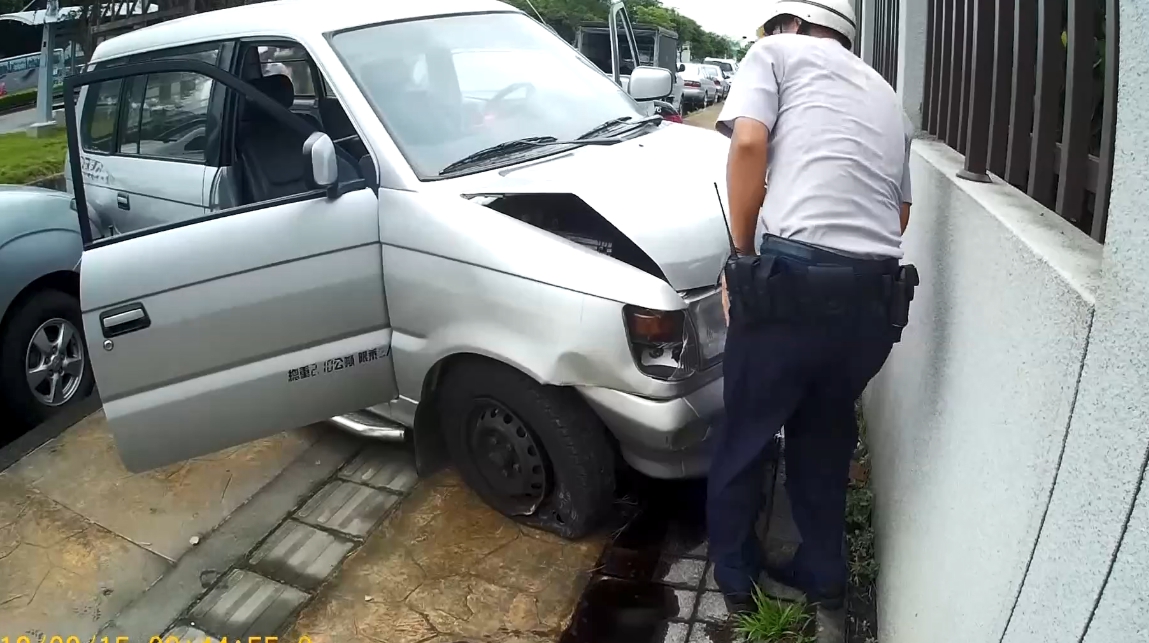 救護人員把這名男子抬上擔架,但他表情很恍惚,而他駕駛的休旅車車頭早就撞爛,就撞在一旁的小圍牆。