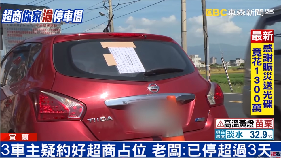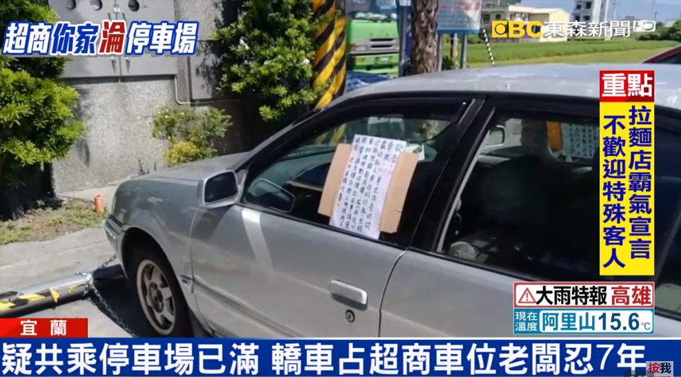 受害超商位在宜蘭,總共有10個停車格供顧客臨停,但最多居然有4輛車長時間停放,霸佔車格的行為,讓老闆忍無可忍,在3輛轎車的後車窗貼上禁止長期停車的警告,老闆也懷疑,疑似是300公尺外的共乘停車場車位滿了,駕駛貪圖方便才來超商停放。