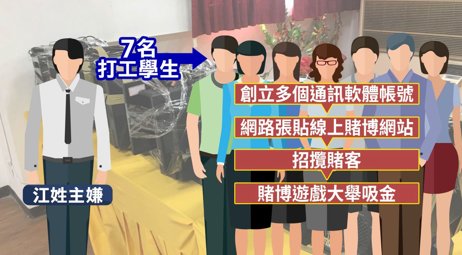 被逮的8名男女都是8年級生,其中江姓主嫌趁著暑假招攬打工學生,讓他們創立多個通訊軟體帳號,每天在網路張貼線上賭博網站,招攬數百名賭客,註冊加入會員,再利用賭博遊戲,大舉吸金。