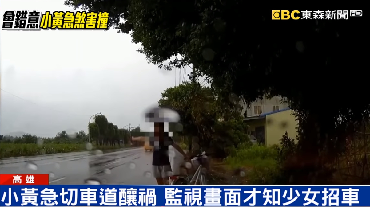 警方一開始以為是小黃,突然間往路邊靠才肇事,但是停在路邊的熱心駕駛人提供的行車記錄器,看到車禍之前,站在路邊的少女伸手揮了一下隨即縮手,因為她意識到招到了計程車,計程車卻已經減速靠向路邊,不幸和機車發生擦撞,少女這時被撞擊聲響吸引,一直看著車禍現場,過了一會才回過來再次揮手,這時鏡頭中出現一名撐傘走來的阿嬤。