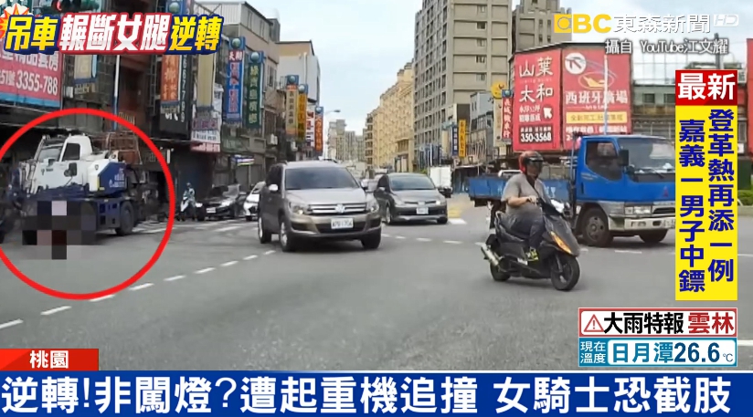 桃園龜山區16日發生一起事故,一名女騎士看到號誌燈由黃轉紅燈時,放慢速度停下,卻遭後方起重機追撞捲入