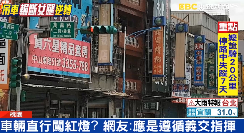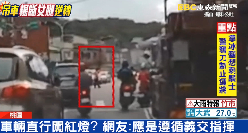 雙腿重傷,如今(18日)有新畫面曝光,雖然號誌是紅燈但有不少車輛直行通過,更可看到一名義交指揮示直行,網友推論不是起重機闖紅燈。
